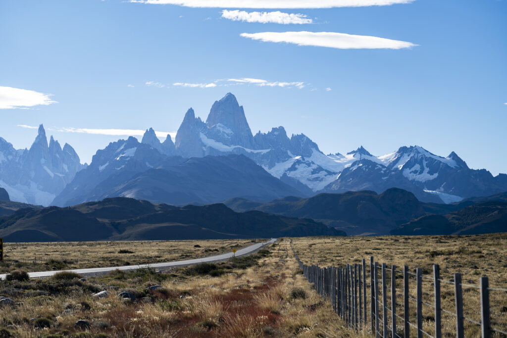 Der Fitz Roy, von dem wir am Anfang nur die Spitzen erahnen können, kommt nur kaum merkbar näher, die schnurgerade Strasse nach El Chaltén führt durch das immergleiche Panorama – links See, rechts Hochebene, ein paar Gunancos äugen über die Wegzäune.