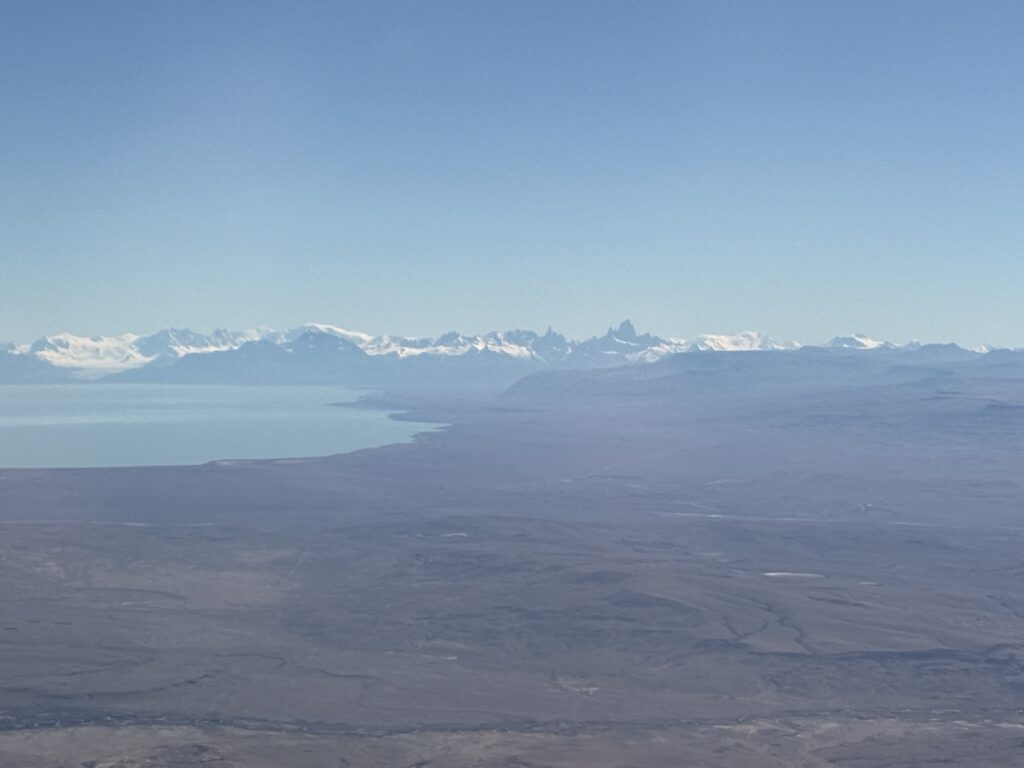 1 Stunde vor Landung verändert sich die Landschaft und wir fliegen über eine Hochebene, am Horizont ragen schneebedeckte Berge hinaus. Der mit den vielen Zacken, das muss der Fitz Roy sein, Patagoniens bekanntester Berg.