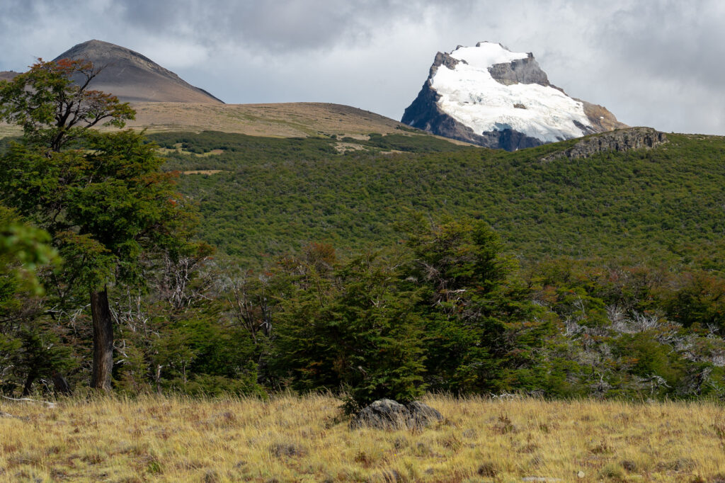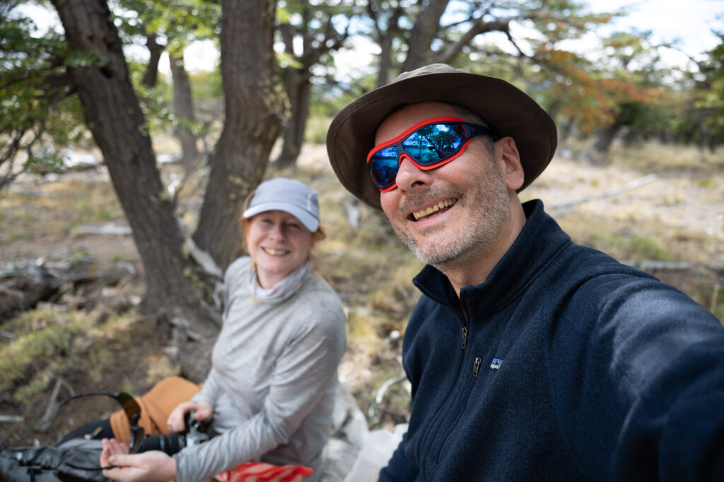 Nach knapp einer Stunde wandern unsere erste Pause an einem wunderbaren schattigen Plätzchen auf einem knorrigen Baumstrunk mit Blick auf den Berg Solo. Der heisst angeblich so, weil er etwas abseits von dem berühmteren Gipfel Trio um den Fitz Roy steht und weil er fast nie von den Wolken verdeckt wird.