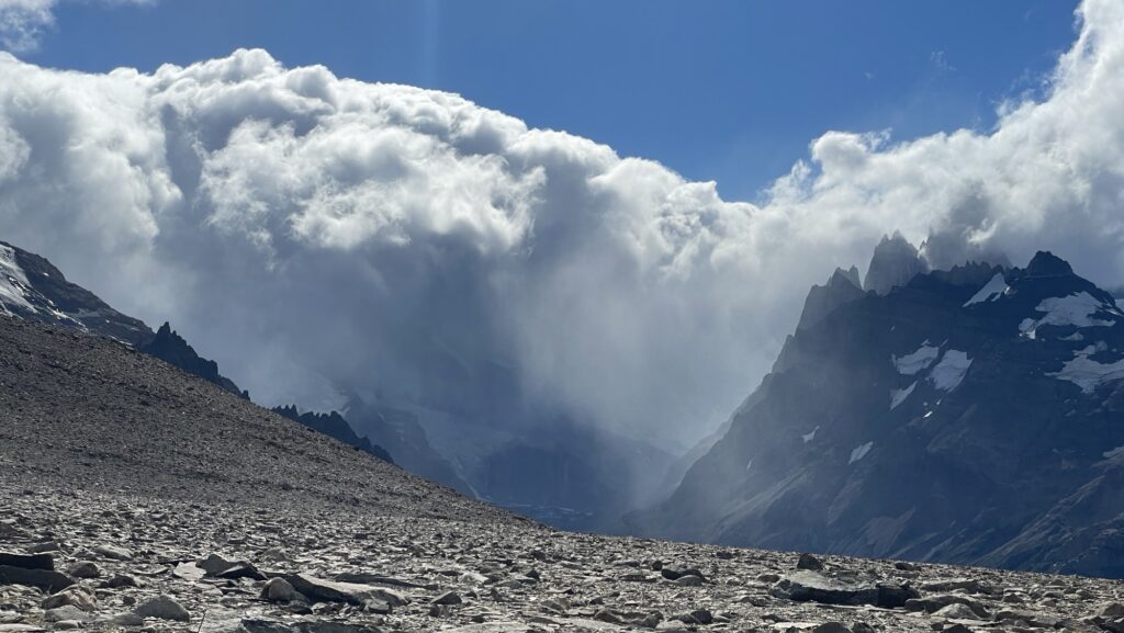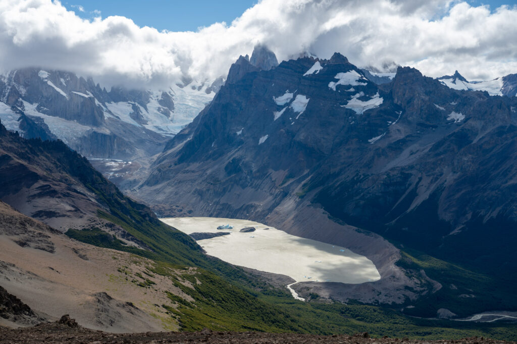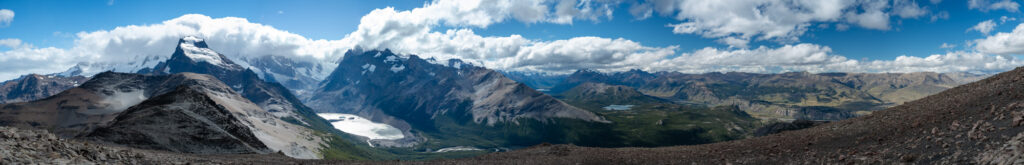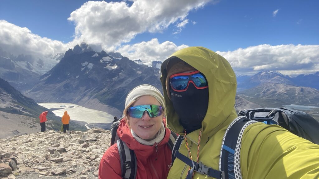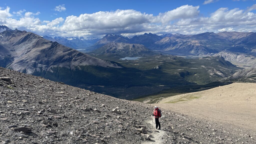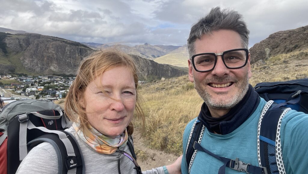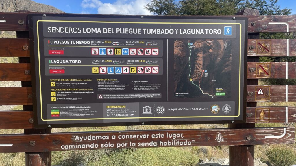 Die Wetterprognose zeigt für heute den 28.2.2026 sonniges Wetter an, dann nur noch Regen. Nach einem kurzen Hotel-Frühstück und dem eigentlich für uns angesetzten Ruhetag, disponieren wir kurzfristig um. El Chaltén liegt 400 m.ü.M. und Loma del Pliegue Tumbado, den wir in rund 10km Entfernung und einer Höhe von 1520 m.ü.M. besteigen wollen, soll gemäss maps.me in 2 Std. 50 Min. erreicht werden. Ein Aussichtspunkt auf die imposanten Gletscher und die Laguna Torre, die wir gestern erklommen haben. Hier folgt unsere persönliche Statistik. 21km hin und zurück, gestoppte Zeit vom Eingang in den Nationalpark bis auf den Gipfel und zurück sind 7 Std. 19 Min.. Runde 2, 5 und 7 sind unsere eingelegten Pausen, in Summe also 1 Std. 11 Min. Das ergibt also eine effektive Wanderzeit von 6 Std. und 8min. Ganz passabel, wie wir beide finden.