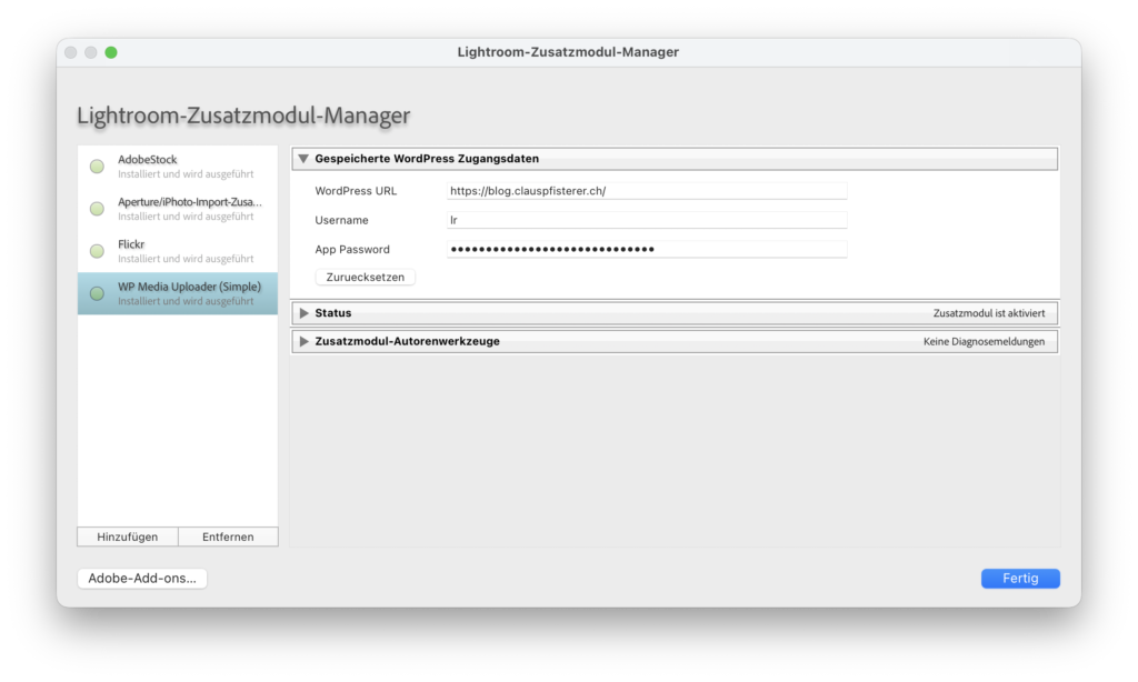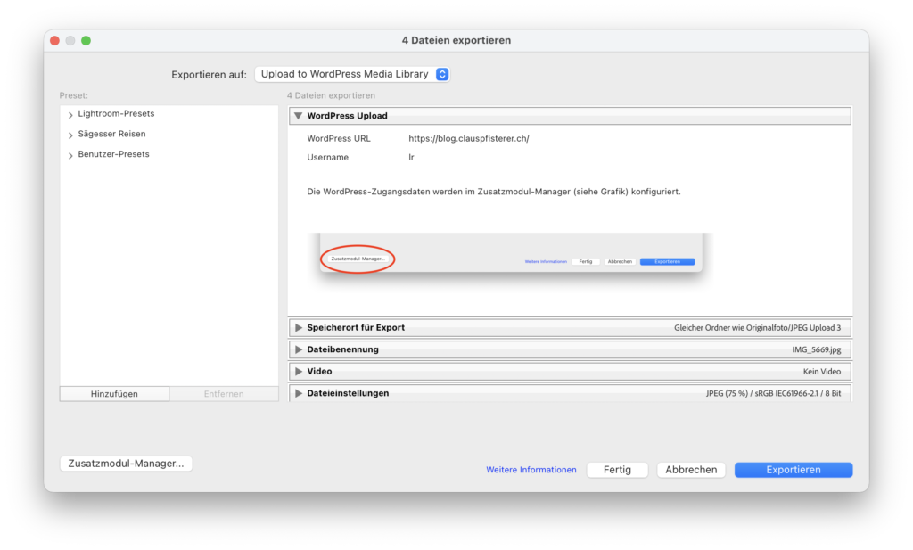 Was mir noch fehlt war ein einfaches Plugin, mit dem ich aus Adobe Lightroom meine Bilder auf den WordPress Blog hochladen kann. Also statt in einen Ordner exportieren und dann manuell auf WordPress hochladen, einfach direkt hochladen.