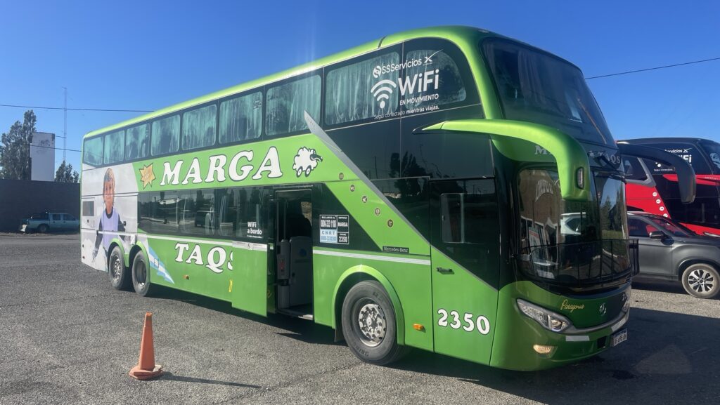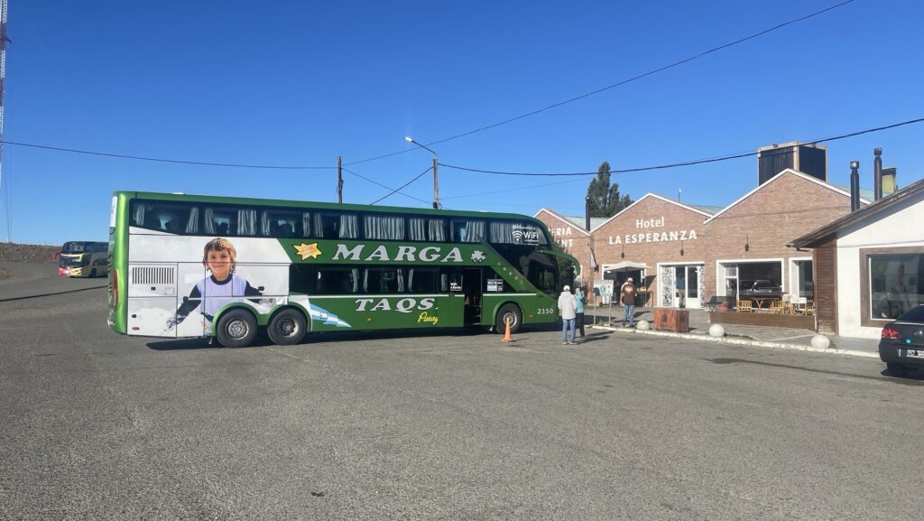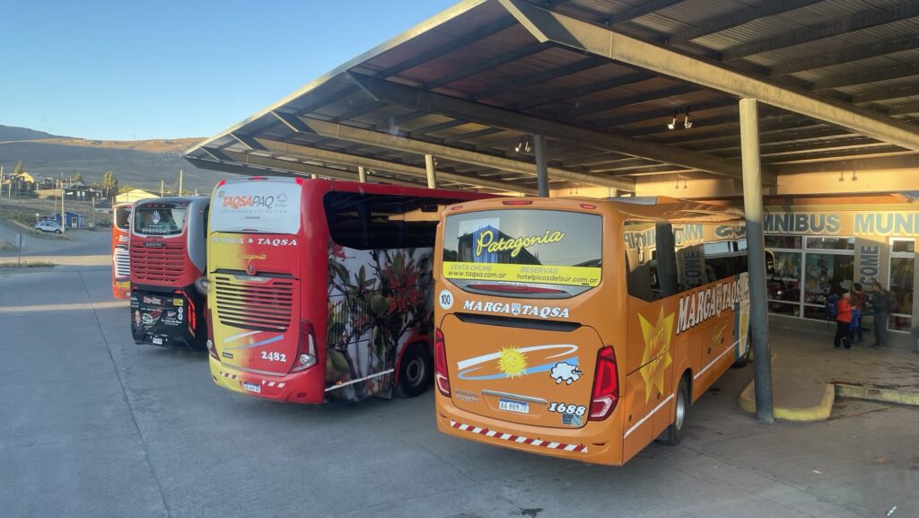 Die Rezeptionistin lacht ziemlich ungläubig, als wir ihr die Instruktion unseres Reisebüros zeigen, gemäss der wir eine Stunde vor Abfahrt am Busbahnhof eintreffen sollen. „No, al aeropuerto a Calafate – maybe one hour, but bus no“. An die argentinischen Zeitangaben haben wir uns immer noch nicht ganz gewöhnt, und so treffen wir eine halbe Stunde vor planmässiger Abfahrt am Busbahnhof ein. Der Bus fährt mit 15 Minuten Verspätung ab. Kein Wunder hat die Rezeptionistin über unsere besorgte Schweizer „aber ist denn das genug Zeit?“ Nachfrage nochmals herzlich gelacht.
