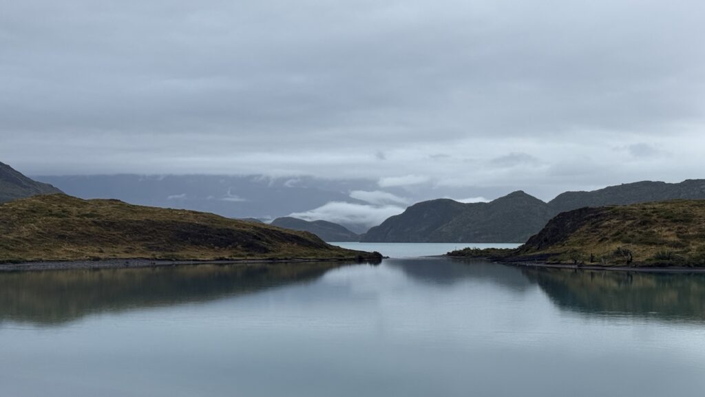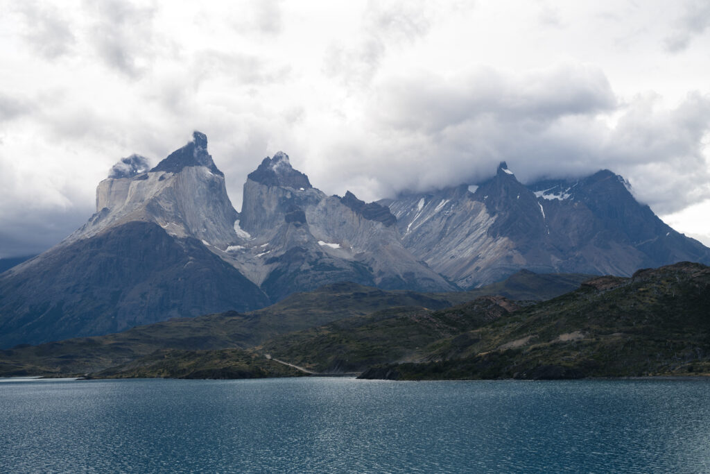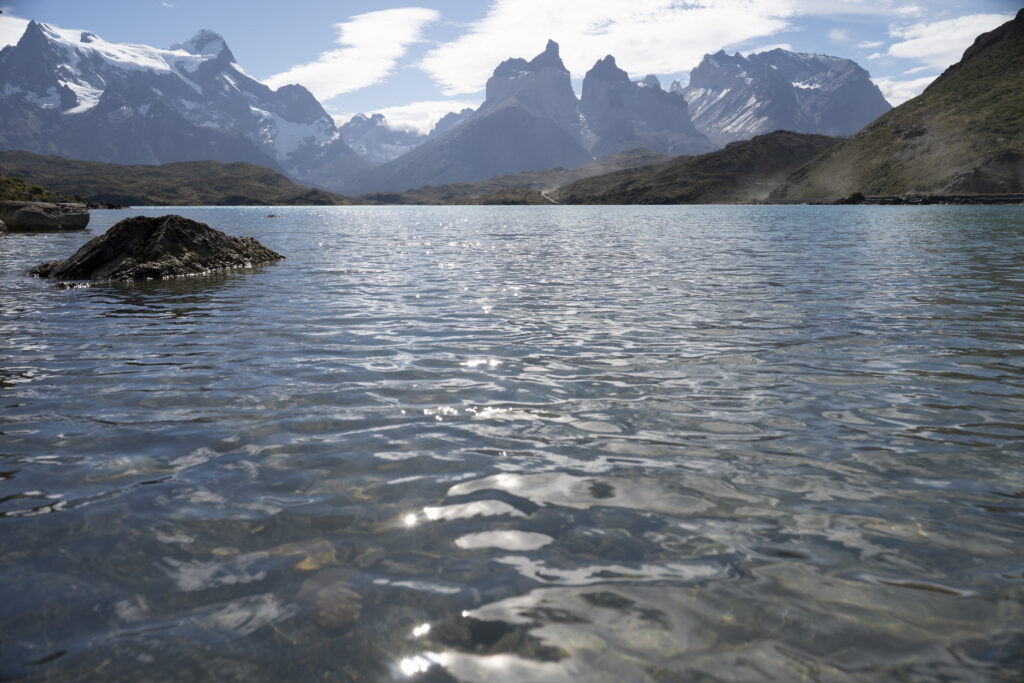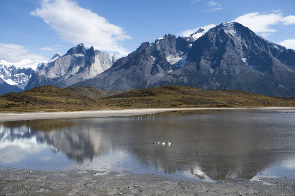 In Puerto Natales hat uns mit einer dicken Wolkendecke verabschiedet, Torres del Paine begrüsst uns mit Sonnenschein. Durch den Nationalpark führen nur Schotterstrassen, und so dauert unsere Fahrt bis zum Hotel noch gut eine Stunde. Das ist aber auch den vielen Fotostops geschuldet, die wir unterwegs einlegen, um die berühmten Torres, Seen mit Flamingos, Seen mit Boten, Seen mit noch mehr Bergen und noch mehr Berglandschaften einzufangen.
