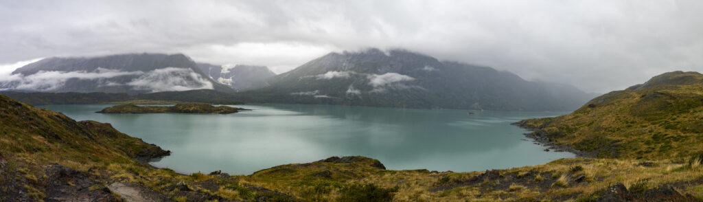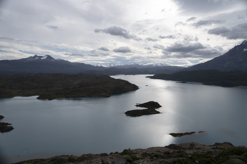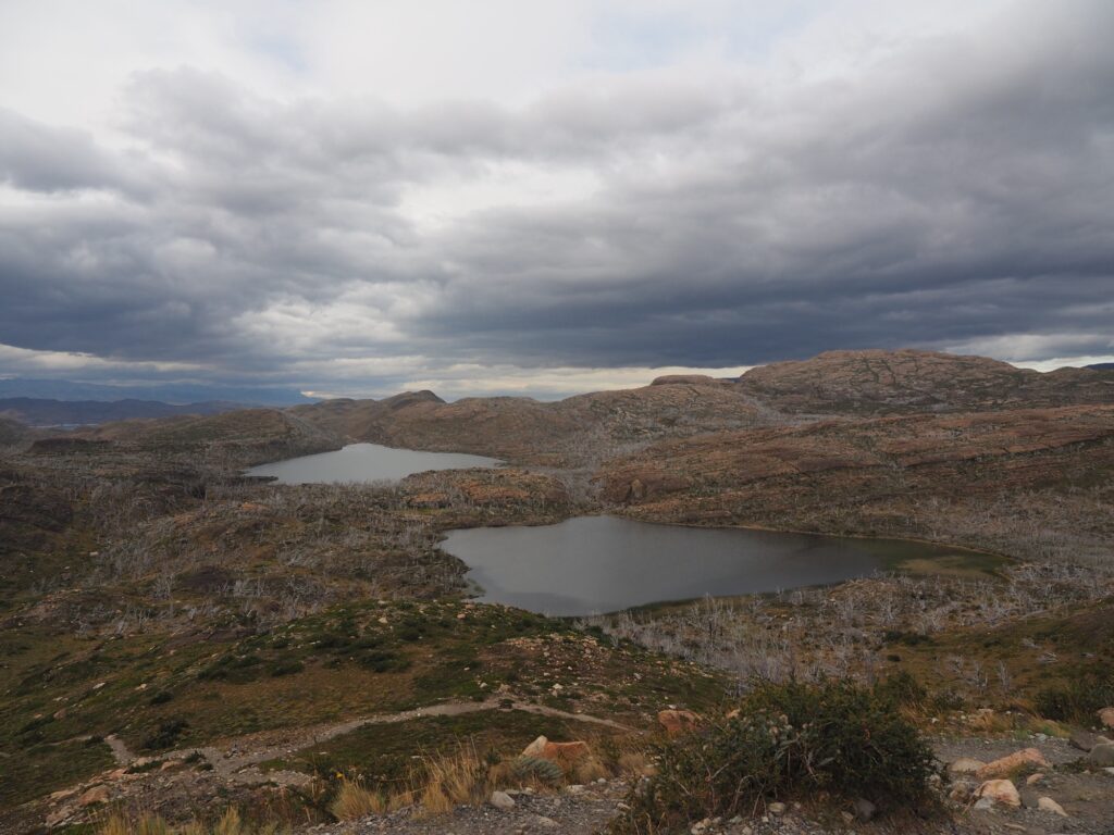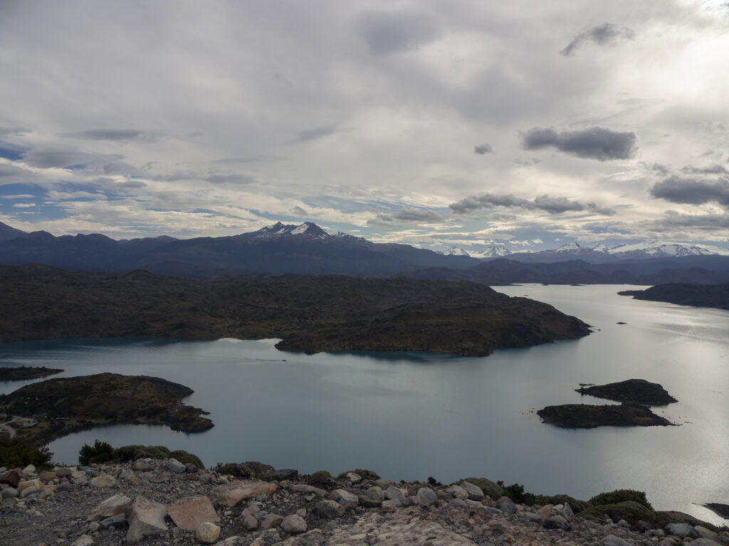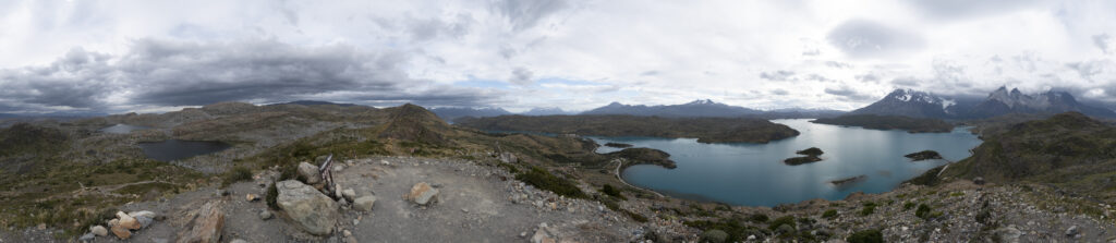 Nach dem Einchecken erklimmen wir den Mirador de Condores direkt beim Hotel. Die Kondore lassen sich heute nicht sehen, aber dafür haben wir einen 360-Grad-Blick. Vor uns der Lago Pehoe mit unserem Hotel und dem Bergmassiv, hinter uns der Südteil des Nationalparks. Hier zeugen noch Unmengen toter Bäume vom letzten verheerenden Brand in 2011, von dem sich der Park immer noch nicht erholt hat.