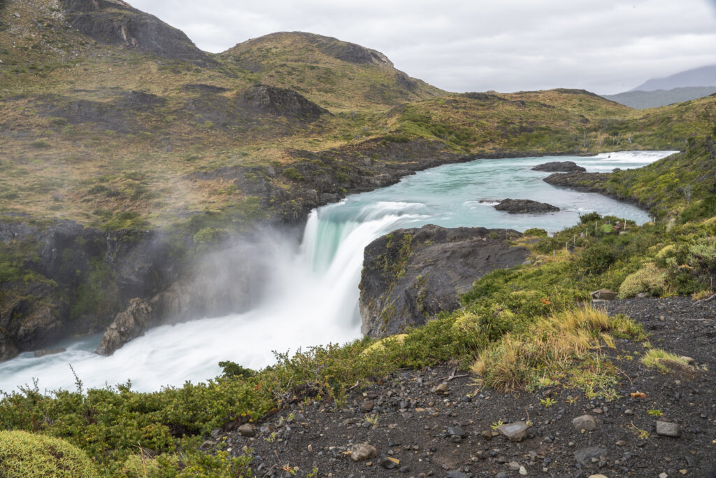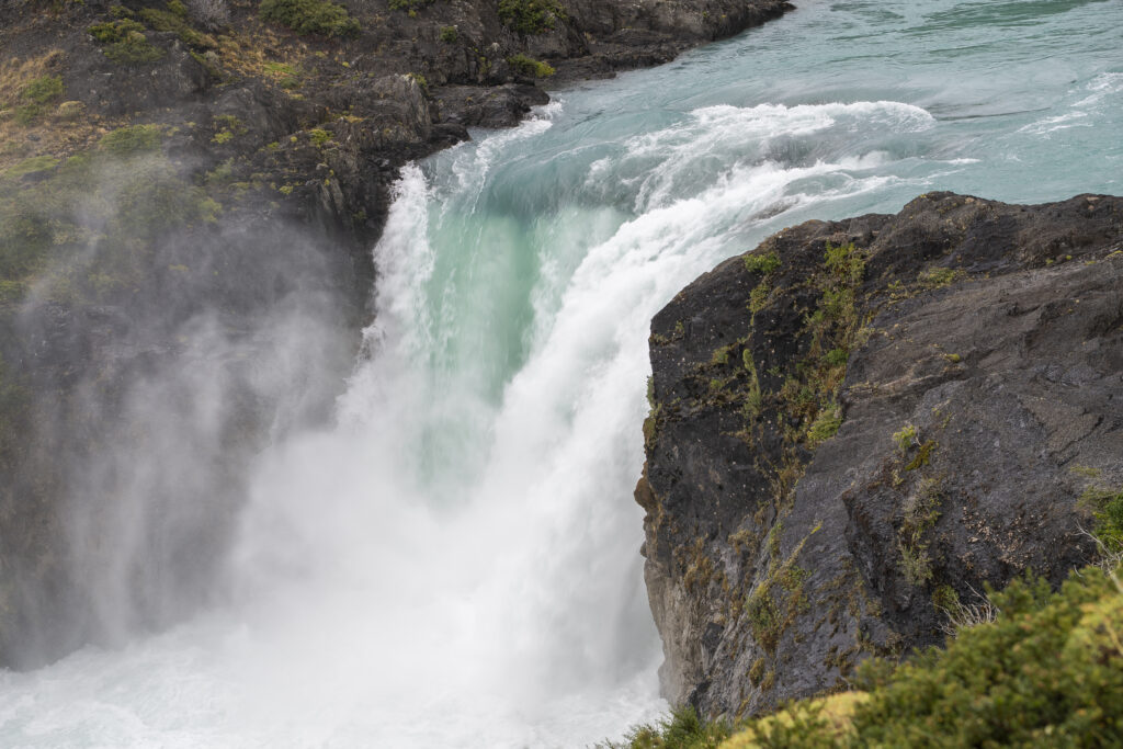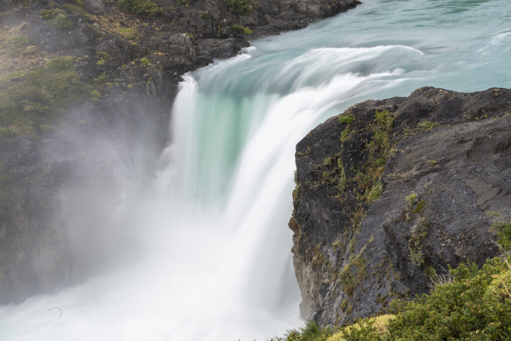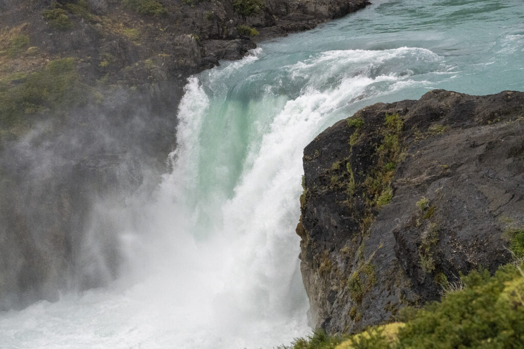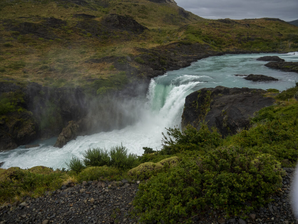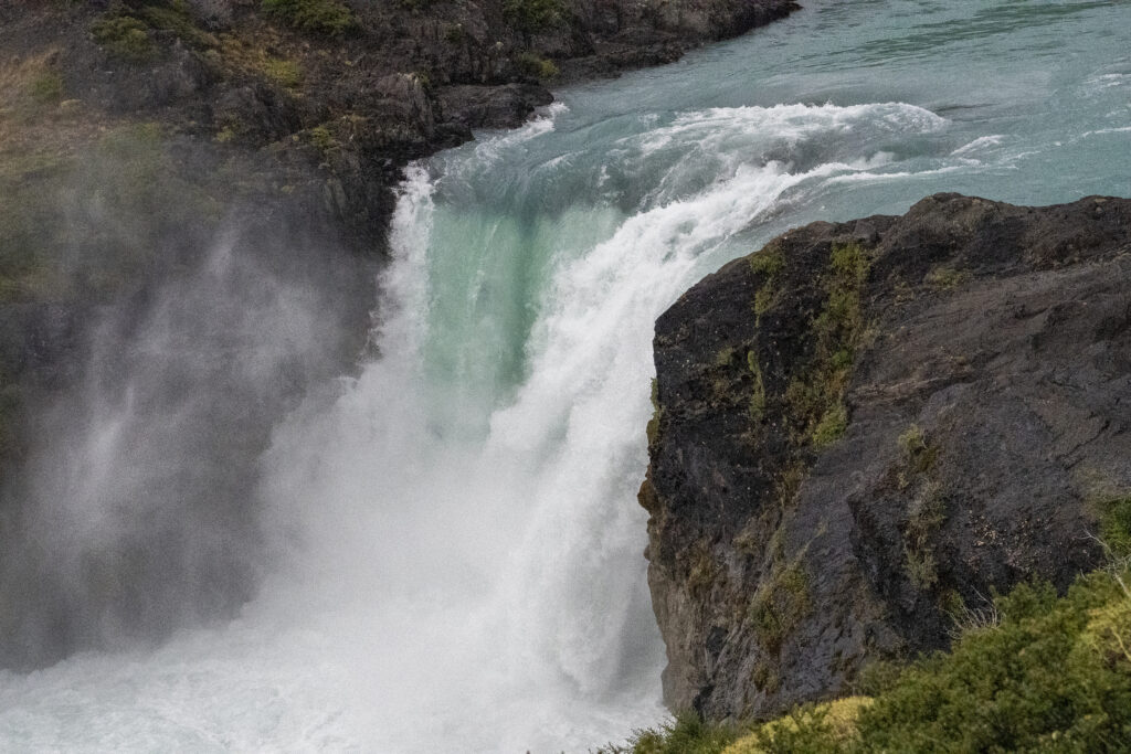 Bei der Ankunft am Grande Salto drängt sich eine kleine Fotoschule fast schon auf. Wie geht das nochmals mit der Kamera um das Wasser in langen Strähnen oder perlig klar zu fotografieren? Zwar habe ich meinen 9 Stufen circular ND Filter diesmal nicht eingepackt, aber das bedeckte Wetter und die Kamera mit ISO 50 lässt sich bei geschlossener Blende f22.0 immer noch 0.6s lang belichten, was zu einer schönen Weichzeichnung des Wasserfalls führt. Das gegenteilige Extrem bei 1/10000s Blende 5.6 und ISO 6400 macht das Wasser perlklar. Nina macht das mit ihrer Olympus Kamera nach und hält ebenfalls einen perlenenden Wasserfall fest.