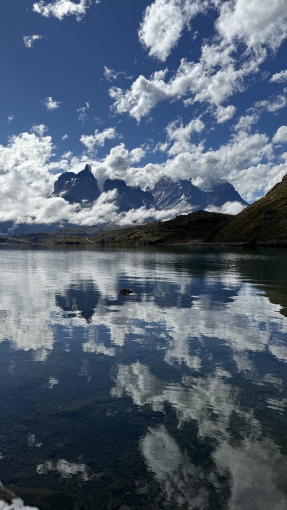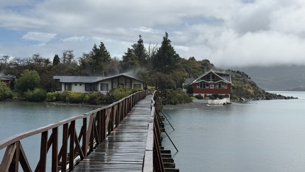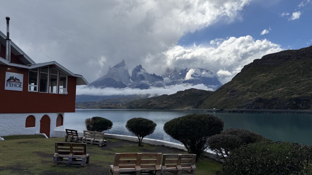 Wir sitzen kurz draussen in der Sonne und warten, dass wir unser Zimmer beziehen können – das Zimmer „with the nicest view“, wie uns wiederholt mitgeteilt wird. Das Versprechen wird gehalten, unser Zimmer blickt direkt auf die Cuernos de Paine.