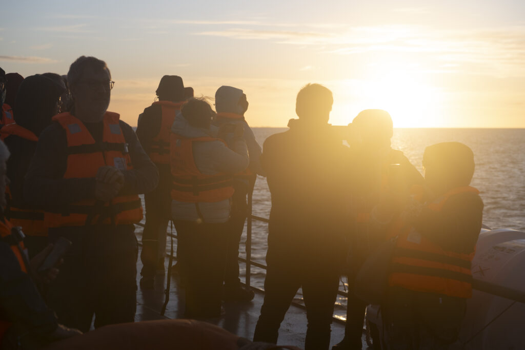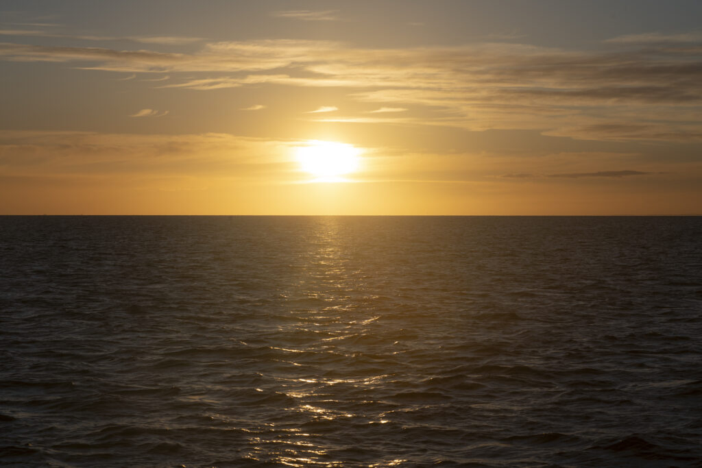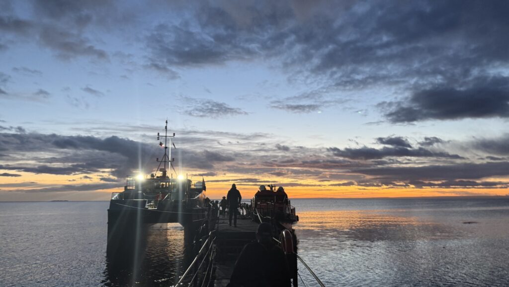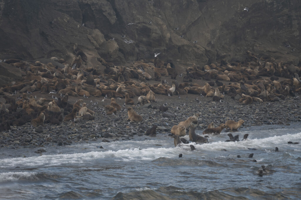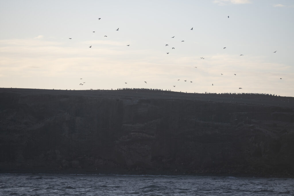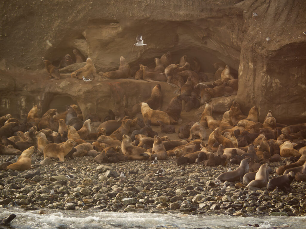 Jetzt fahren wir aus der Stadt zum Steg unseres Katamarans der uns in Kürze zur Insel schippern wird. Herrlich ist der Sonnenaufgang zu betrachten und bald schon steuert der Kapitän vor einer vorgelagerten Insel um uns eine Hundertschaft von Sealions zu zeigen. Das Grunzen ist schon fast ein bisschen unheimlich anzuhören. Über unseren Köpfen fliegen Kormorane, im Wasser schwimmen die Sealions und am Strand grunzen sie um die Wette.