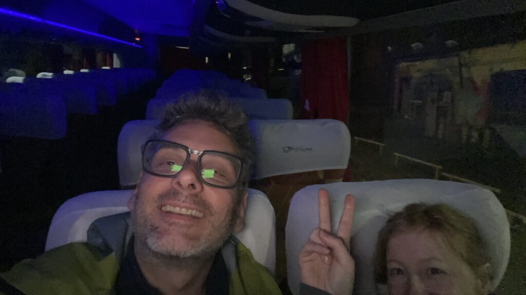 Relativ früh am Morgen, es ist ist kurz vor 6 Uhr, werden wir mit einem grossen Bus abgeholt. Wir sind die ersten Gäste für die Isla Magdalena Excursion. Wir nehmen schlaftrunken den Platz in der ersten Reihe ein und beobachten den hyperaktiven Buschauffeur wie er hin und her speeded und den Bus noch komplett bereit macht für den grossen Ansturm den wir in Kürze in der Pole Posistion beobachten können. Der Chauffeuer startet den Motor und will losfahren, da merke ich mit Schrecken, dass ich in der Hotel Lobby mein Handy liegengelassen habe. Wie von der Tarantel gestochen springe ich auf und klopfe an die gläserne Fahrerkabine um dem Chauffeur klar zu machen, dass ich nochmals ins Hotel zurück muss. Wenige Minuten später kehre ich mit hohem Puls zurück und der Fahrer lächelt mich und Nina an und sagt was von „teléfono celular“, womit er goldrichtig liegt.